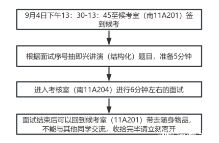 说明:1、所有考生凭身份证/员工证提前于13:30-13:45至候考室签到。进入候考室后手机统一上交,在候考室可翻阅自己携带的书籍资料。等叫号抽题准备,5分钟准备时间内不允许使用手机等电子设备查阅资料;