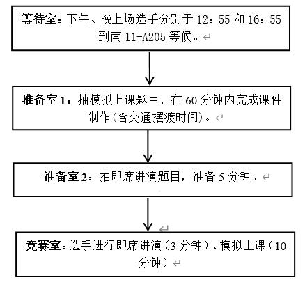 1、每位选手时间共计78分钟,其中模拟上课准备时间为60分钟(含交通摆渡时间),即席讲演准备时间5分钟。每位选手正式比赛时间为13分钟,其中即席讲演时间为3分钟,模拟上课时间为10分钟。每位选手进入竞赛室后,先进行即席讲演,然后开始模拟上课。