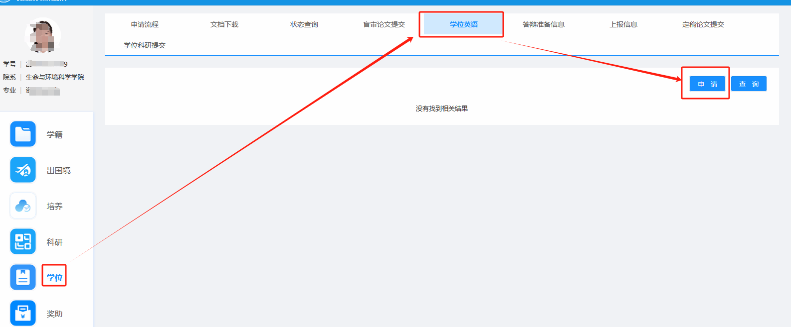 1、请各同学在研究生系统中完成学位英语审查申请,申请途径:研究生系统——学位——学位英语。