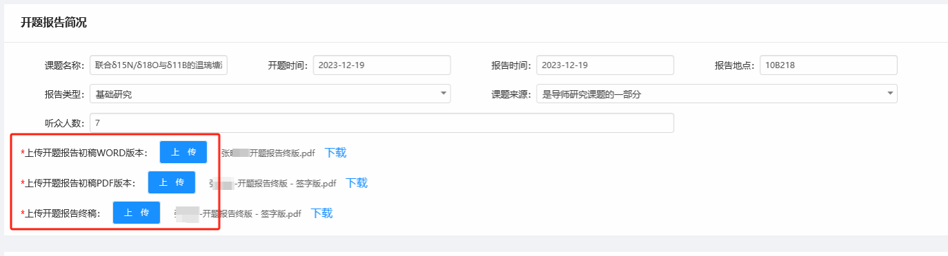 研究生系统中需提交开题报告初稿word版、初稿PDF版、终稿PDF版签字稿,提交后请导师进行审核。