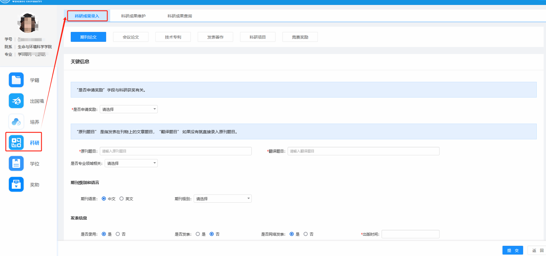 提交途径:①研究生系统——科研——科研成果录入——提交;