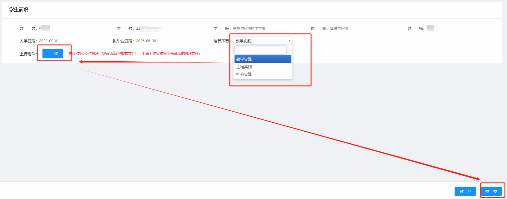 注意:学术型硕士需完成教学实践、工程实践、社会实践三项的2项,社会实践由学工办统筹安排;专业学位硕士按照培养方案,资源与环境专业员工完成不少于1年工程实践、药学专业员工完成不少于1年专业实践、学科教学(生物)专业员工完成不少于1年教学实践。