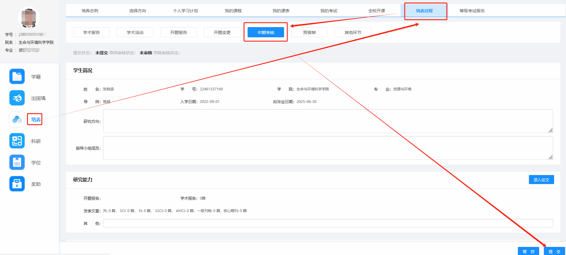 上传途径:研究生系统——培养——培养过程——中期考核,上传《个人小结》后提交,并请导师进行审核。