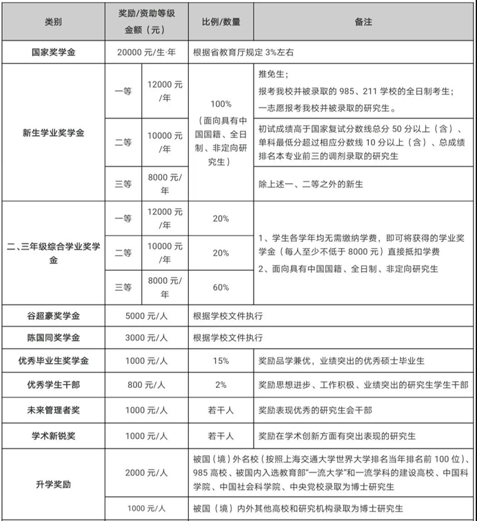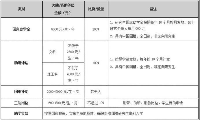 新入学的全日制非定向硕士研究生,文科类研究生每年可获得奖助学金不少于16500元,理工科研究生每年不少于18000元。每年获得奖助学金最高的可超过46000元。
