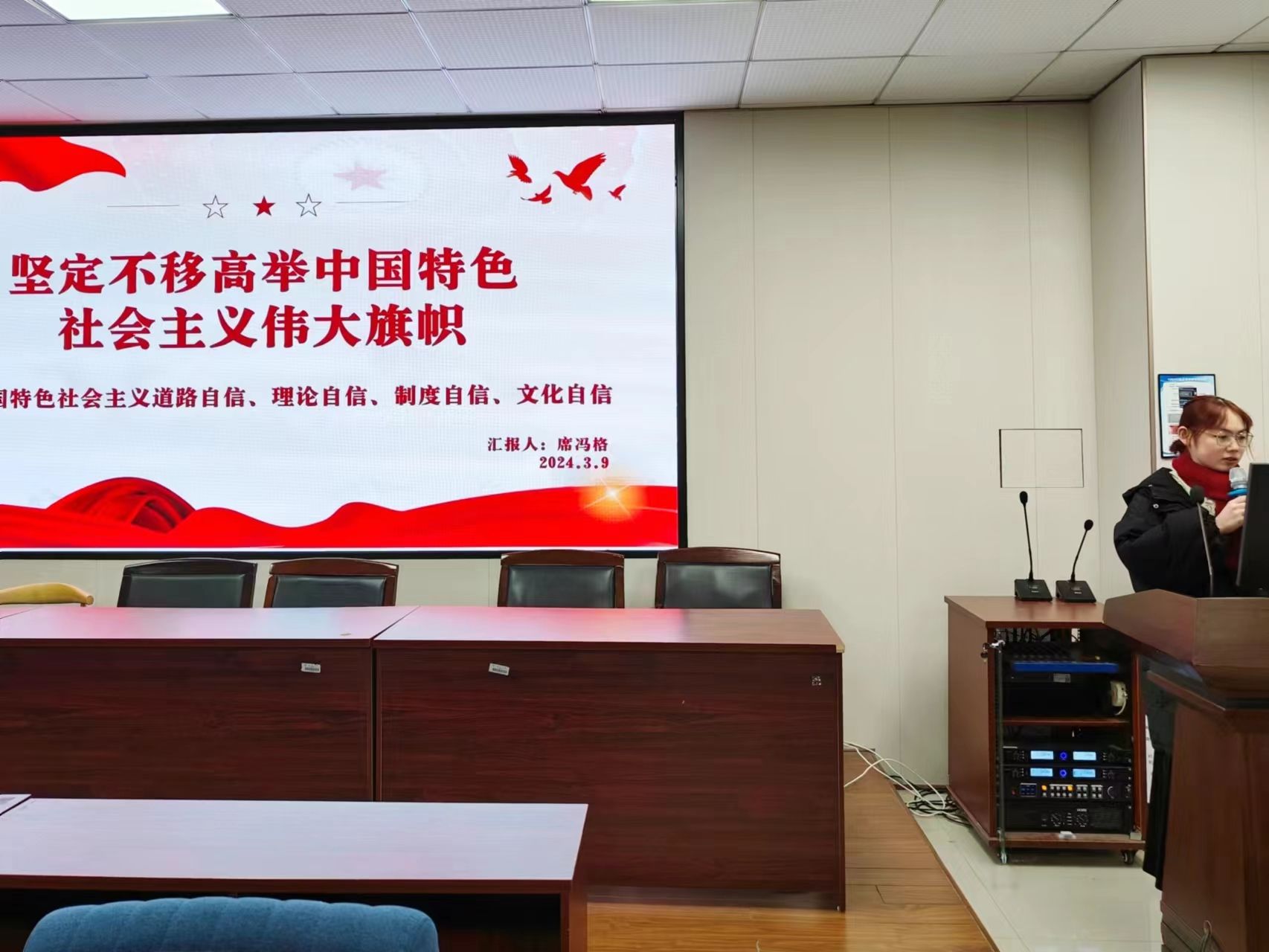 为促使全体员工党员达到“四个自信”的思想自觉,坚定对中国特色社会主义现代化建设必胜的信心,公司员工党支部于3月9日在10B202召开“坚定中国特色社会主义道路自信、理论自信、制度自信、文化自信”和“中国特色社会主义进入新时代”主题学习会。本次学习会由席冯格同志、王菁同志主讲,董家喻同学主持,共计49名党员和37名入党积极分子参加。