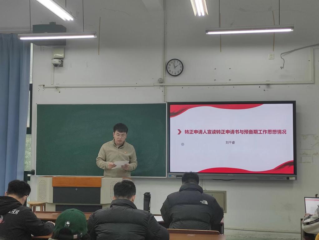 本次转正大会主要有六项议程:一是转正申请人宣读转正申请书与预备期工作思想情况汇报;二是培养联系人汇报转正申请人预备期相关情况;三是党小组介绍转正申请人预备期情况;四是支委会介绍转正申请人预备期的教育考察情况;五是与会党员充分讨论答辩意见讨论是否按期转正;六是无记名投票表决。会上,3位预备党员依次宣读转正申请书并汇报了自己预备期间在思想、学习、工作、生活等方面的表现。随后,通过两位培养联系人、党小组、支部委员会报告了对刘千睿、马萍、毛晶等3名预备党员转正事宜的审查意见,并且与会党员根据日常表现进行提问,反映了他们的群众基础、自身优缺点以及在今后阶段努力的方向。最后,通过现场有表决权的正式党员进行无记名投票表决,一致同意3位预备党员按期转正为正式党员。