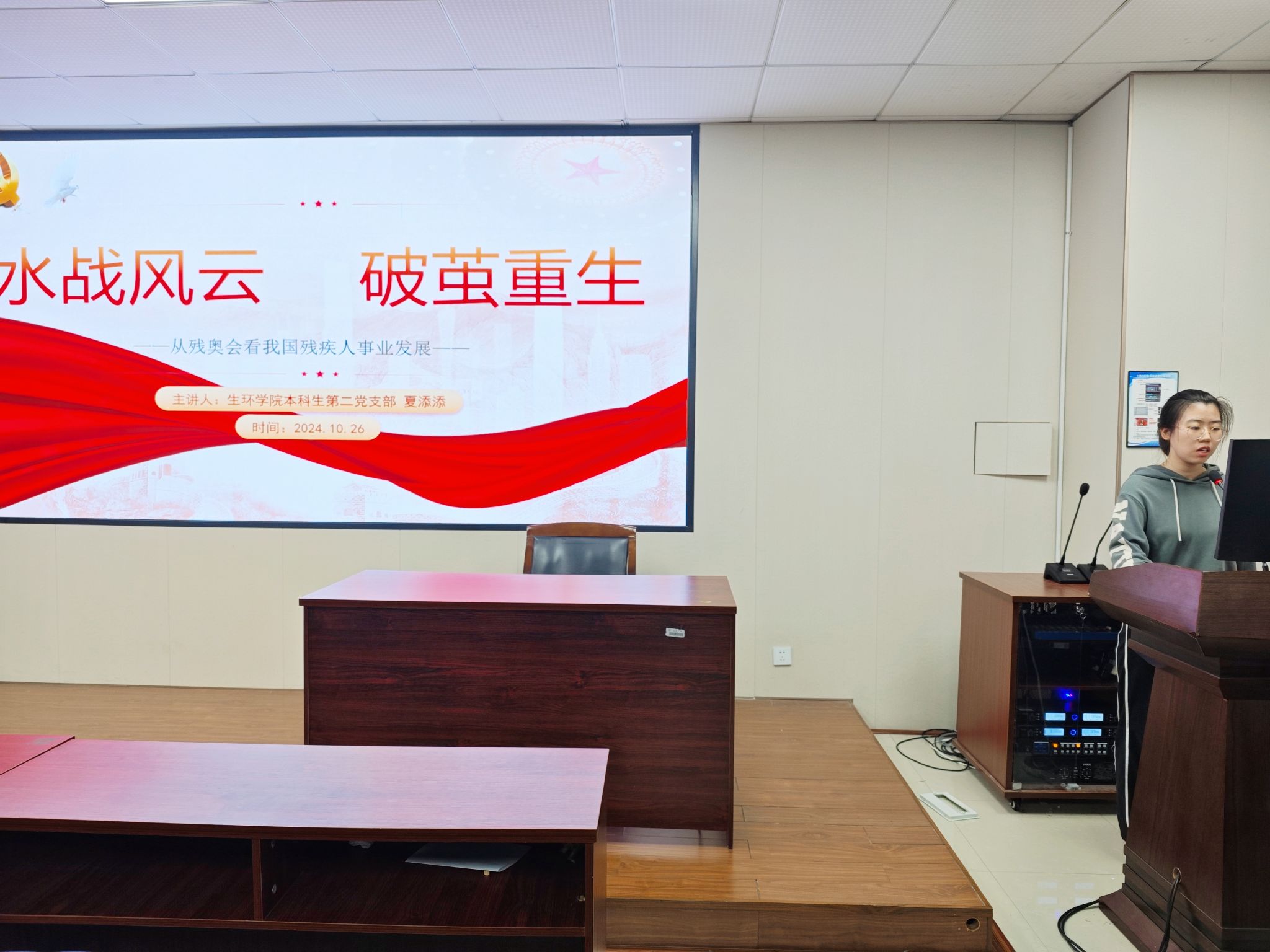 为深入学习贯彻党的二十届三中全会精神,积极响应“五学五讲五示范”活动要求,增进对残疾人体育精神的认识和理解,yl永利集团官网登录员工党支部于10月26日在10B202召开“水战风云,破茧重生”主题学习会。本次学习会由yl永利集团官网登录员工宣讲团夏添添同志、宓佳彤同志主讲,徐苏彤同学主持,共计30名党员和43名入党积极分子参加。