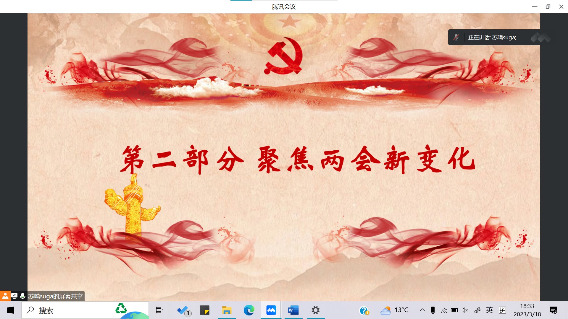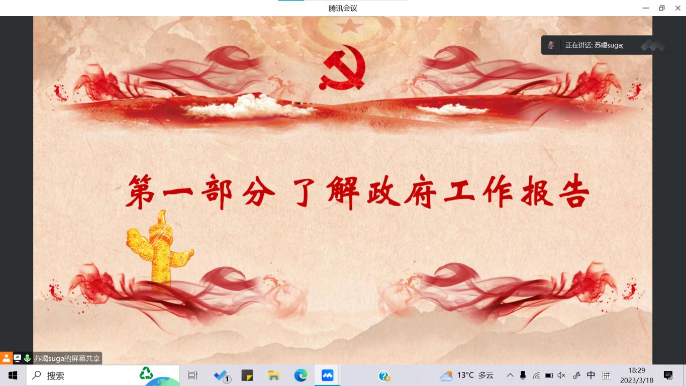 接着,与会成员学习两会新变化。此次2023年两会新变化主要围绕政坛新阵容、经济开新局、民生新叙事、开放新举措、因应新变局等方面。多方面的新变化,让与会成员感受到我国在政治、经济、民生等方面的蓬勃生命力以及坚持发展前进的决心。