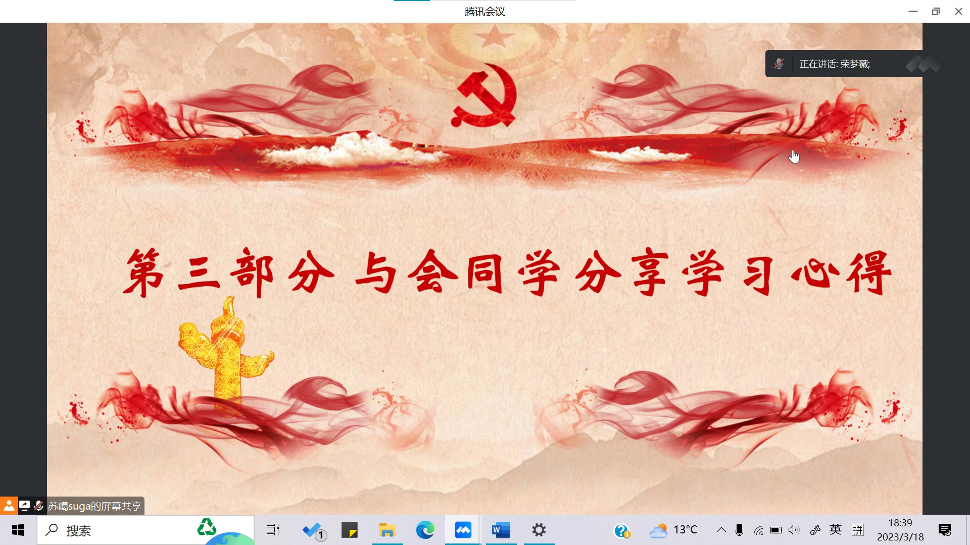在全面贯彻党的二十大精神开局之年,在亿万中国人民向着第二个百年奋斗目标砥砺前行之时,2023年全国两会于2023年3月5日在北京人民大会堂正式召开。为了进一步提升理论知识水平,学习贯彻党的二十大精神以及2023年全国两会精神,2023年3月18日晚18:30,公司本科生第一党支部于线上召开“聚焦两会”主题学习会,本次学习会支部党员、入党积极分子共38人参与,由支部代理组织委员姜皓月同志主持。
