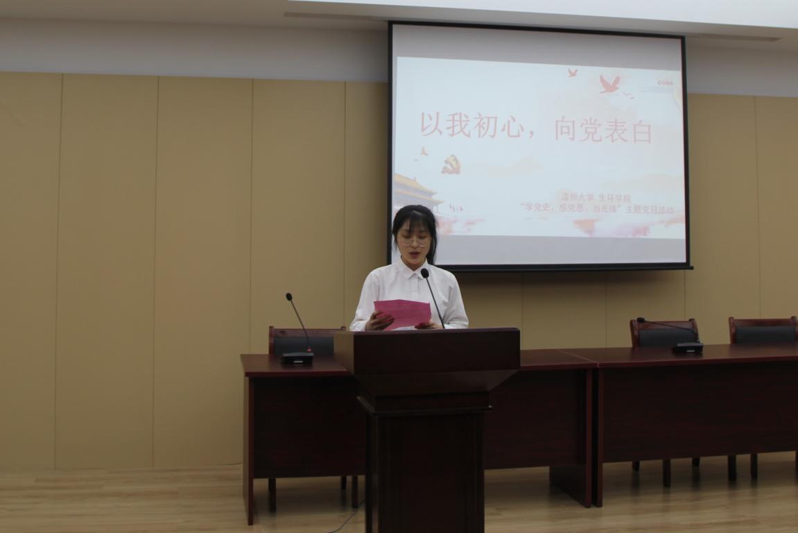 随后,在辅导员赵舒展老师的带领下,党员们齐聚在浙南一大纪念馆的会议室,进行“以我初心,向党表白”分享会。由施依凡、罗荣华等十一名党员向大家分享自己的入党初心和向党说的心里话。“感谢党让我看到中国的绿水青山,感谢党让我见证阅兵仪式上的中国风采,感谢党让我感受到中国力量与中国速度。我在祖国的怀抱和党的关爱下成长,作为一名党员我感到无比自豪。” “我想引用我的老乡,在守边护边时壮烈牺牲的陈祥榕同志的战斗口号向党表白——清澈的爱,只为党,只为中国……”党员们用一句句深情白白,向党讲述着自己的初心,同时表达了对党最真诚的热爱和祝福。