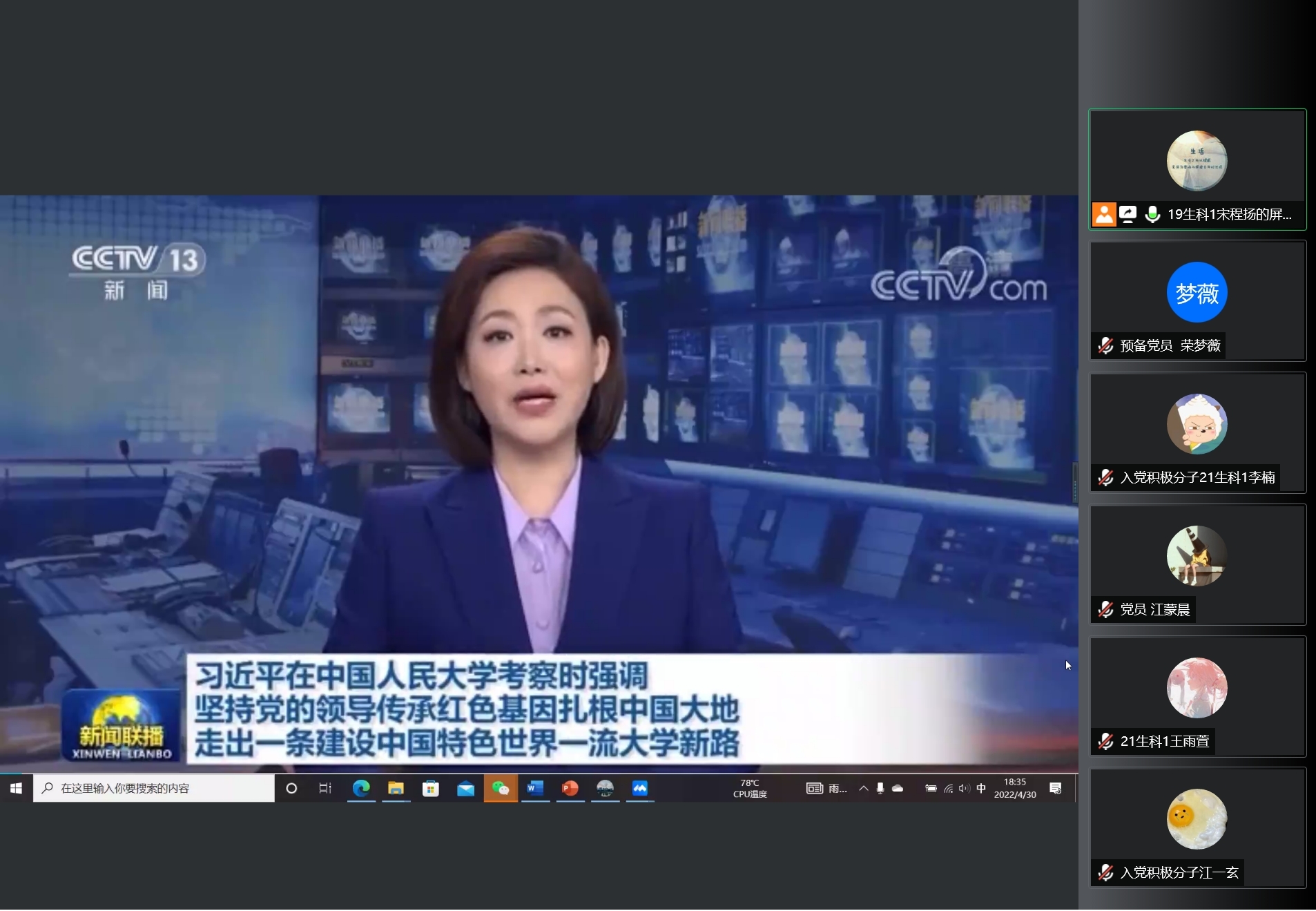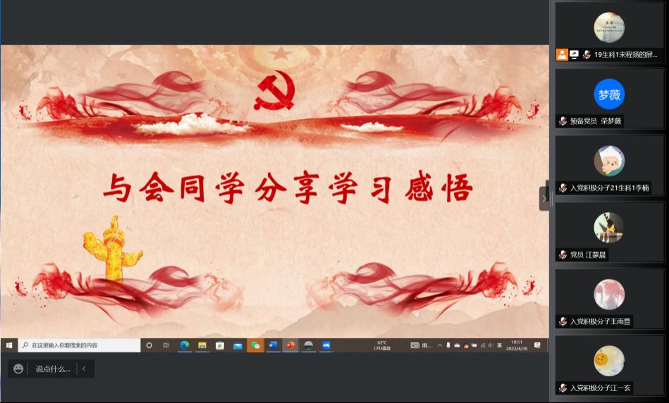 2022年4月30日晚,公司本科生第一党支部在线上组织开展了“争做堪当民族复兴重任的时代新人”主题党日活动。支部党员、入党积极分子等五十余人参加活动,活动由宋程扬同志主持。