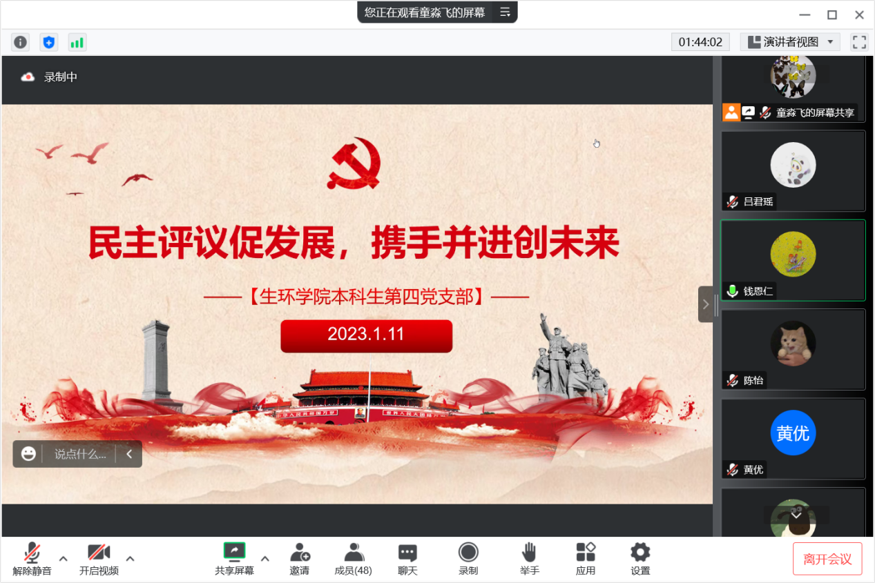 为加强和规范党支部政治生活,加强党员教育、管理和监督。公司本科生第四党支部于2023年1月11日下午,开展了“民主评议促发展,携手并进创未来”的组织生活会。结合寒假工作安排,此次组织生活会采取线上会议的形式开展,由代理副书记童淼飞主持,参与会议的党员共48人,正式党员39人。