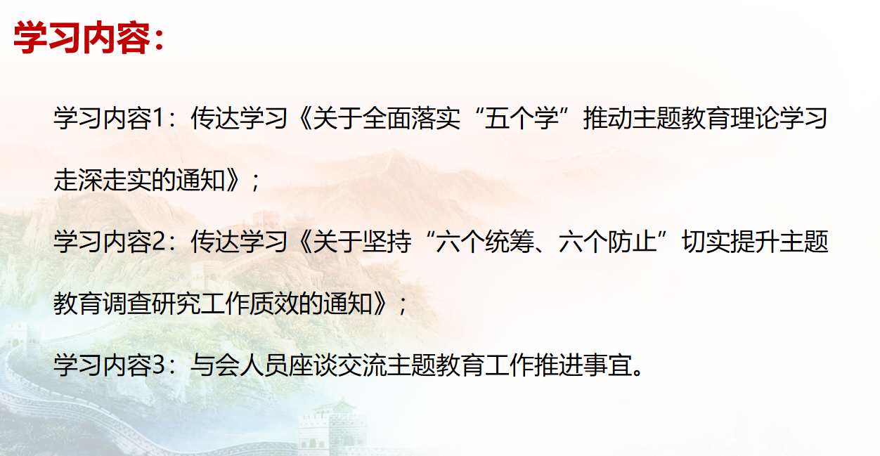 与会人员按照公司主题教育工作实施方案及任务清单,共同探讨了主题教育工作开展的时间节点及具体实施安排,切实保证主题教育理论学习走深走实,调查研究做到实事求是,突出问题导向,深入一线研究情况,实打实解决问题。