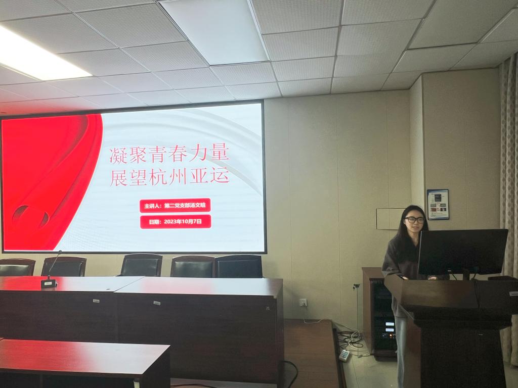 为了弘扬亚运精神,传递青春力量,公司员工党支部于2023年10月7日在10B202召开“红色精神,凝聚青春力量,展望杭州亚运”主题学习会。本次学习会由汤文晗同志和林紫涵同志主讲,郑伊凡同学主持,共计45名党员和43名入党积极分子参加。