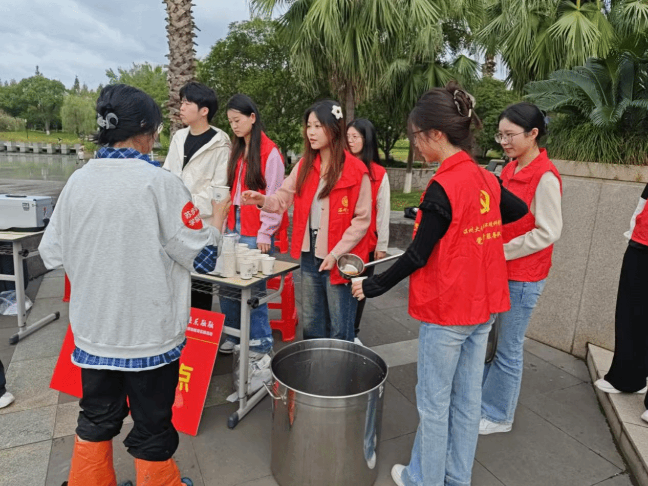 在活动中,党员们充分发挥先锋模范作用,积极参与到现场布置、引导及物资收发工作中,对所准备的物资进行详细清点,确保每一种物资的数量准确无误,之后将所有物资按需分发给各个参赛小组,确保活动的顺利进行。为了给师生们送上温暖,党员们精心准备了红糖姜茶,在寒冷的天气中为大家带来了一丝暖意。