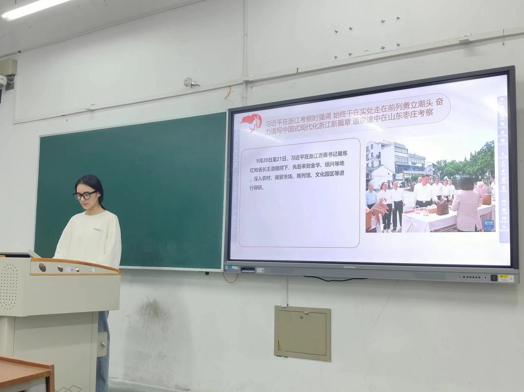 会议第一项,党员同志首先在汤文晗同志带领下关注习近平总书记在浙江省的考察动态。党员同志随习近平总书记在义乌市后宅街道李祖村,从一个村庄看千村万村,学习“描绘好新时代的‘富春山居图’”的方法,领悟“千村示范、万村整治”这一重要战略举措的内涵;在义乌国际商贸城二区,从小商品看大市场,见证中国特色社会主义在义乌的成功实践,坚定理论自信与制度自信;在绍兴市诸暨市枫桥镇,从新时代“枫桥经验”看群众路线,领悟“紧紧依靠人民群众,把问题解决在基层、化解在萌芽状态”工作方法的内涵,体悟群众路线的理论意义和实践成效;在绍兴城西浙东古运河,从千年水脉看千年文脉,揽胜古老大运河时代新风貌,坚定文化自信。支部党员通过学习,领悟完整准确全面贯彻新发展理念的方法,学习“浙江是新时代全面展示中国特色社会主义制度优越性的重要窗口”的丰富内涵,深刻领悟“八八战略”对浙江发展的指导。