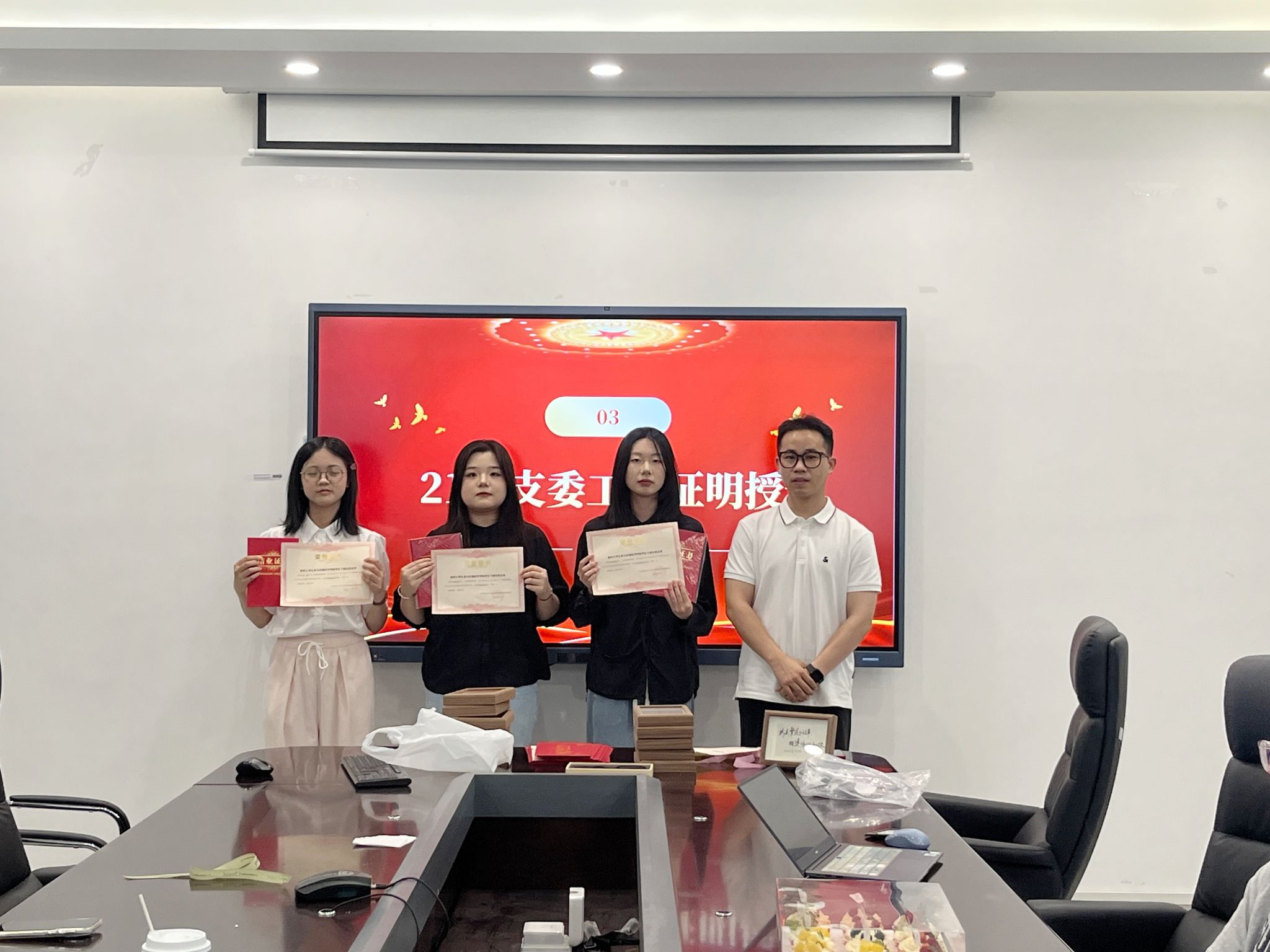 随后,支部对四位21级支委的工作进行总结表彰,肯定其在支部建设中展现出的责任担当与奉献精神,并为他们颁发聘书。