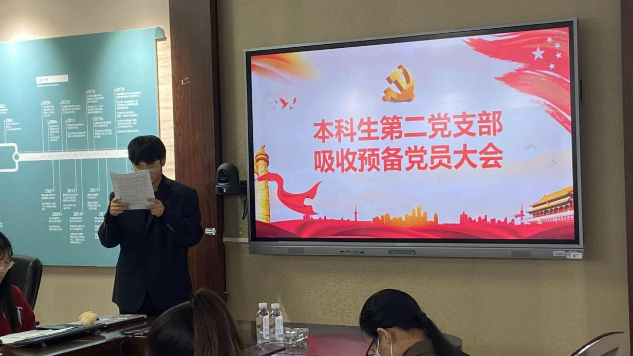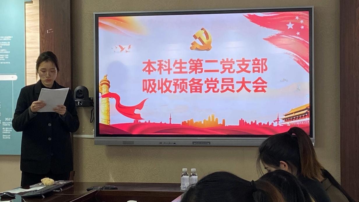 2022年12月2日下午16:30,公司本科生第二党支部在南校区10B—204教室召开2022年下半年预备党员接收大会。本次会议,共有12名正式党员、12名预备党员、4名发展对象参与,由支部代理宣传委员胡前前同志和代理纪检委员吴淑雯同志主持进行。