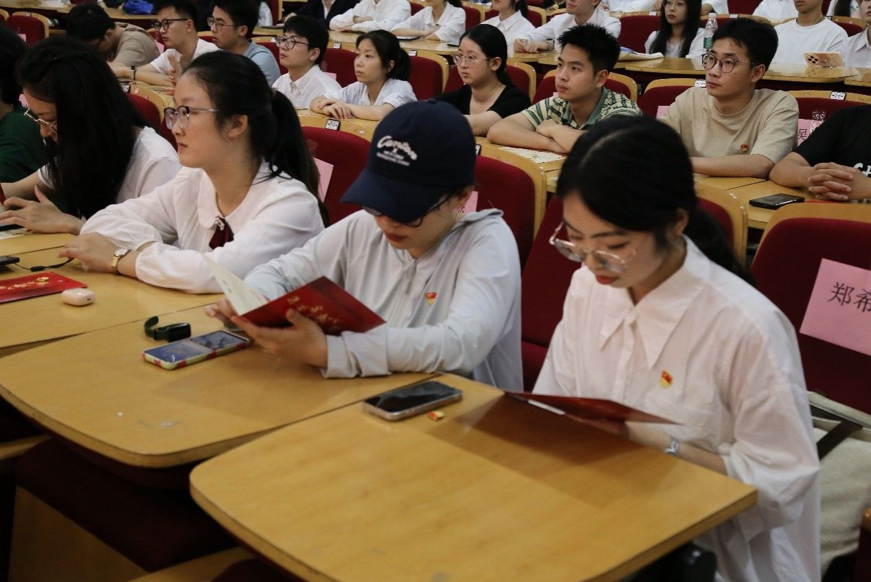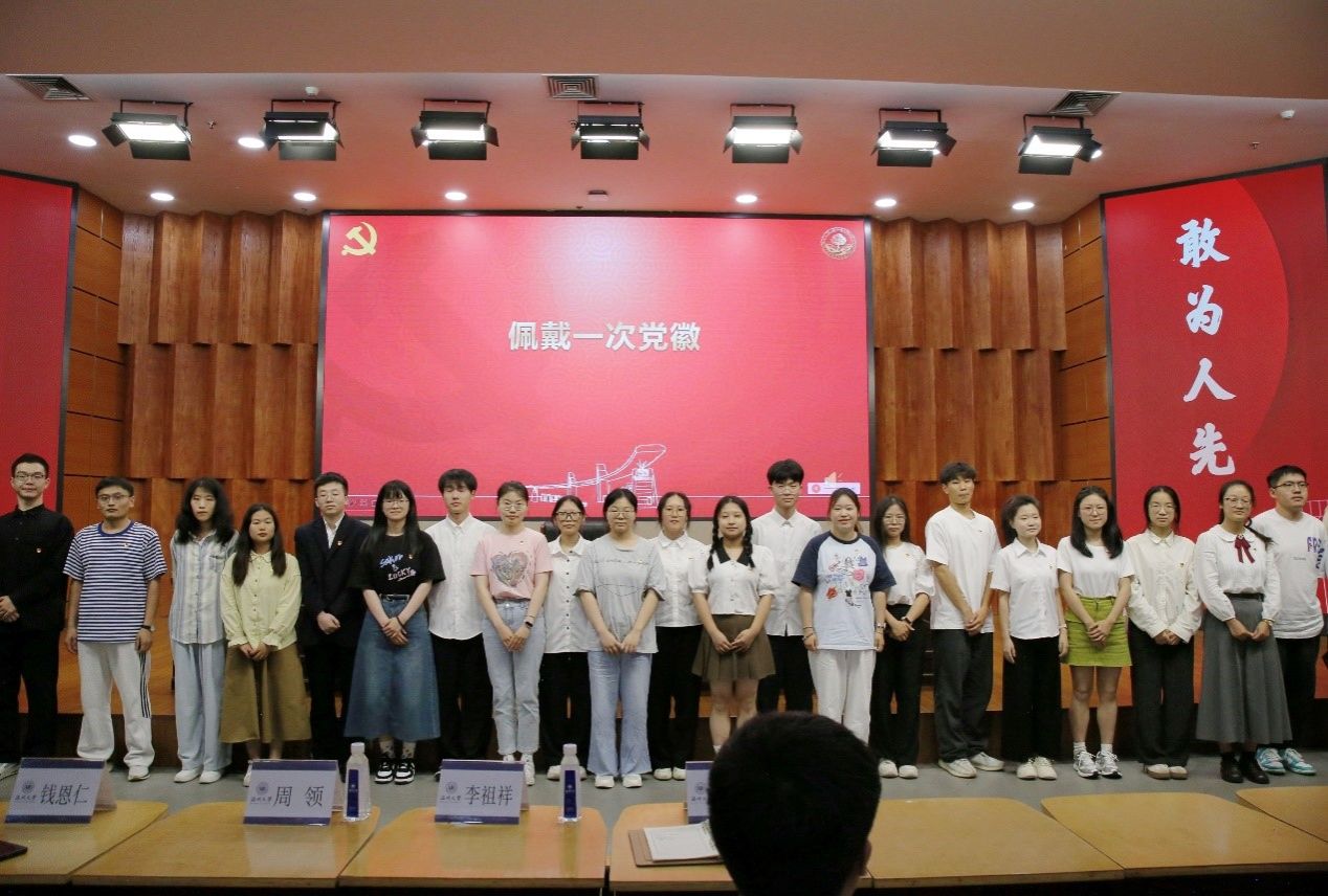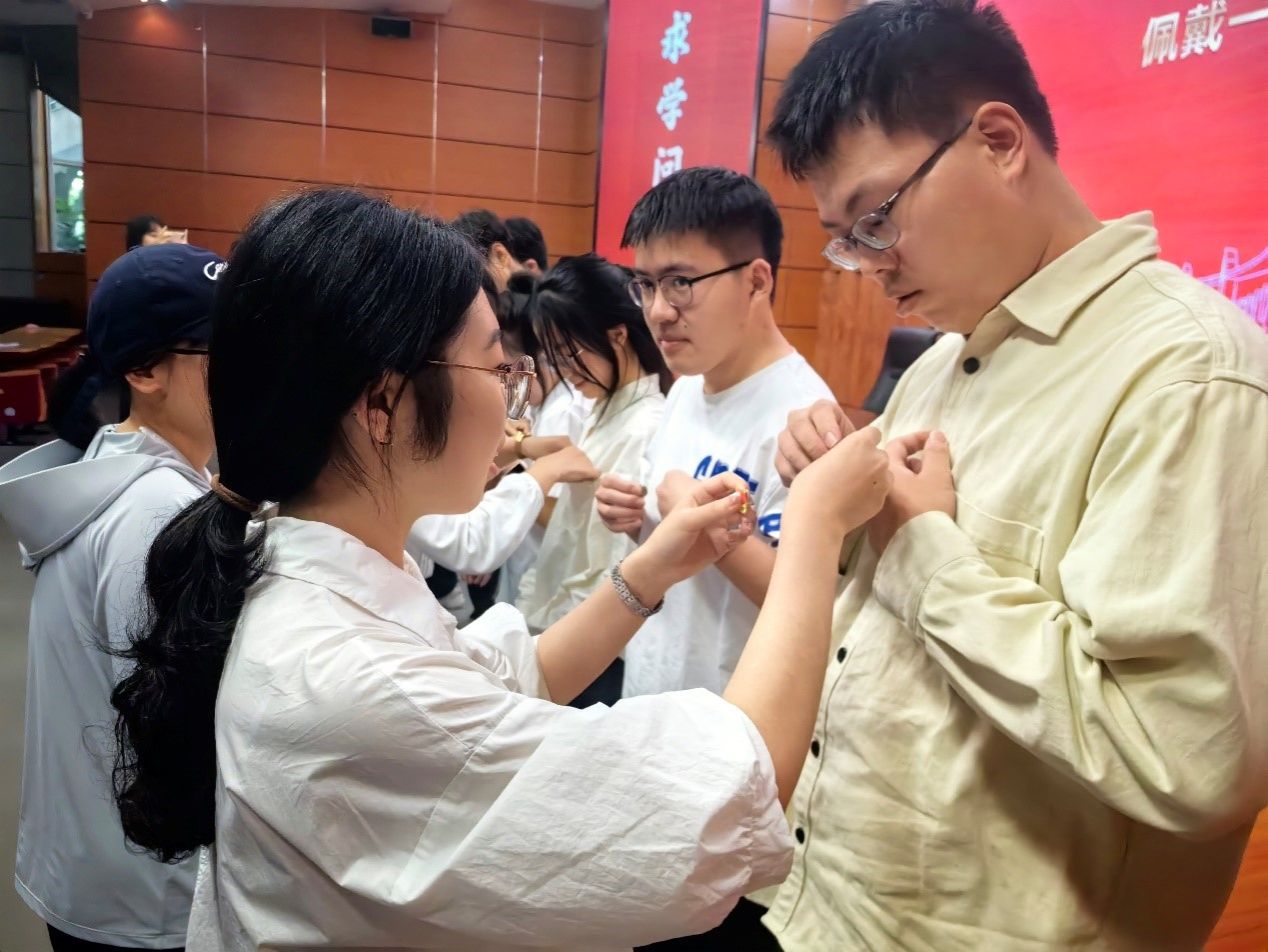 会上,毕业生党员为新发展党员佩戴党员党徽,旨在引导新发展党员强化政治身份意识,增强毕业生党员自身的荣誉感和使命感,充分展现了薪火相传的精神。