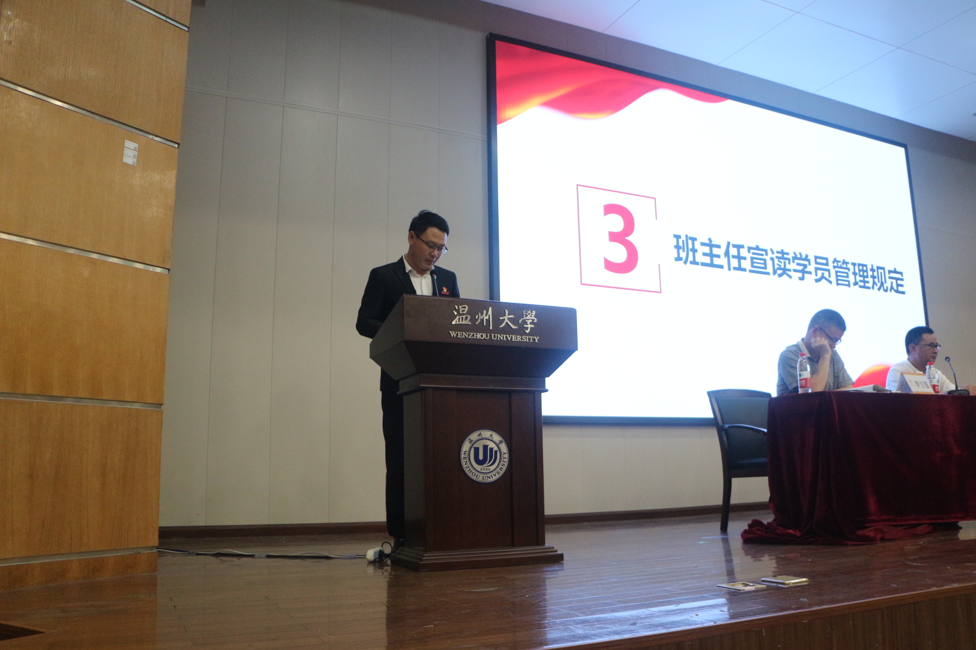 随后,培训班班主任潘龙飞老师宣读了学员管理规定。潘老师着重强调了此次预备党员培训班的纪律,希望学员们通过培训端正入党动机,坚定理想信念,为早日成为一名光荣共产党员奠定基础。