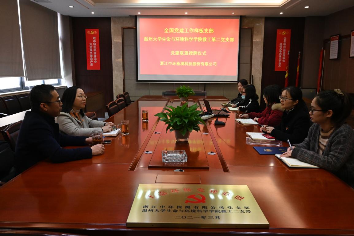 为进一步加强公司党建工作与人才培养、科技创新、社会服务的深度融合,推进校地产学研相融,服务人才培养和生态环保,2022年3月3日,公司党委书记姜海燕、教工第二党支部书记王奇一行分别来到浙江中环检测科技股份有限公司、浙江中蓝环境科技有限公司,进行党建联盟正式授牌活动。