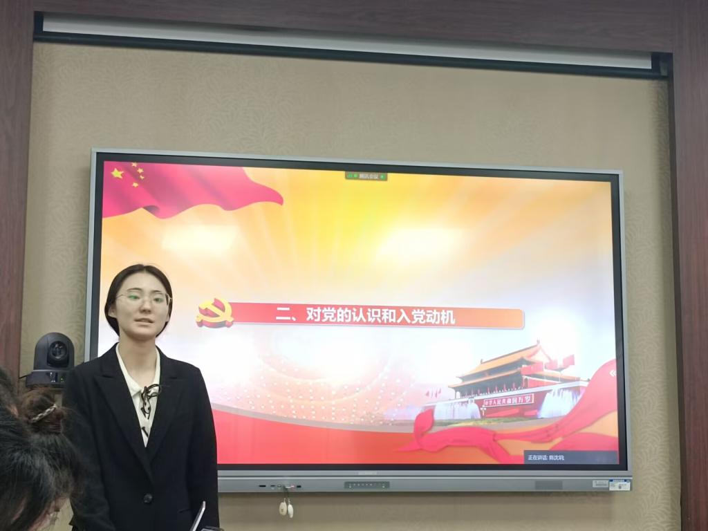 会议第二项议程,拟发展对象按照胡陈晓、林紫涵、刘嘉琦、汤文晗、王菁、吴奕、虞欣瑜、张子涵的顺序,借助PPT,从思想,学习,工作以及生活等方面汇报自己的情况。之后由魏金燕同志公布拟对象的党内外座谈会情况。之后由2-3名党员进行现场提问,考察拟发展对象的党的理论知识等方面的学习情况。