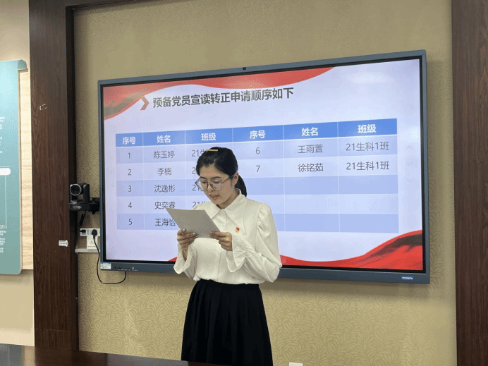 根据《中国共产党章程》和《中国共产党发展党员工作细则》要求,本次会议讨论了陈玉婷、李楠、沈逸彬、史奕睿、王海怡、王雨萱、徐铭茹7名预备党员的按期转正事宜。第一项议程,申请转正的7名预备党员依次向大会汇报了自己在预备期间在思想、学习、工作、生活等方面的表现,并总结了所取得的进步,同时也剖析了个人仍存在的不足之处,表明了自己的态度和决心。第二项议程,由入党介绍人就其预备期间的思想情况和现实表现向大会作了报告,并向党组织表明对其按期转正的意见和建议。第三项议程,支部委员会报告了对陈玉婷等7名预备党员转正事宜的审查意见,在此基础上支部其他正式党员结合预备党员日常生活的实际情况进行提问。第四项议程,与会党员通过无记名投票方式进行表决。最后经支部党员一致投票通过,同意陈玉婷、李楠、沈逸彬、史奕睿、王海怡、王雨萱、徐铭茹7名预备党员按期转正为正式党员,大会决议结果将于近日报上级党委备案审查。