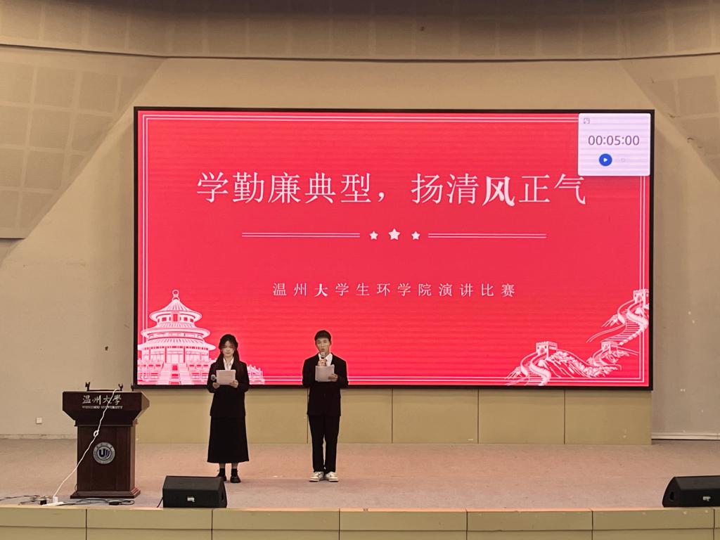 随着雄壮的中华人民共和国国歌奏起,演讲比赛正式拉开帷幕。17位参赛选手用慷慨激昂的演讲,真挚饱满的情感,给评委老师和观众同学们留下了深刻印象。他们运用振奋人心的演讲词和悦耳动听的配乐,剖析了自古以来贪官污吏的反面案例,将自己对廉政、反腐的深刻理解娓娓道来,又讲述了焦裕禄、张桂梅、李方华等优秀楷模鞠躬尽瘁的事迹,歌颂了前辈们的清廉风范,充分展现了生环学子勤思践行、奋发作为的青年风采。