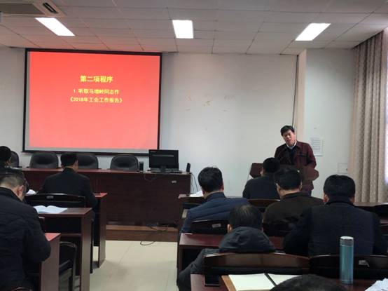 公司分工会主席马增岭作工会工作报告,汇报了一年来公司工会的各项工作,包括公司民主管理进程、教职工文化建设、工会服务水平和能力、工会文体活动等,并公开了工会经费收支情况,也对今后工会工作提出建议,最后倡议全体教职员工在新的一年里继续发扬主人翁精神,围绕公司和公司中心,真抓实干,为公司和公司建设发展做出更大贡献。