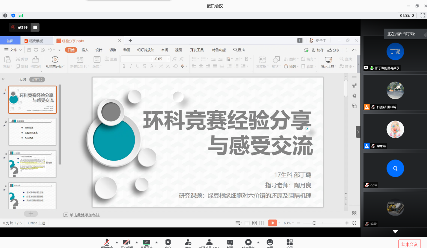 会上,陈经理给同学们分析了当下的竞赛情况并加油鼓劲,让同学们保持积极的心态以及端正的态度。柯强老师从环科竞赛的主题和内容着手,介绍了环科竞赛的情况与要求;刘金文老师则详细地讲述了生科竞赛的时间安排和实验内容。两位老师的耐心介绍加深了同学们对环科竞赛和生科竞赛的了解与认知。在获奖团队的分享交流环节中,应雪萍老师着重强调了细节的重要性,比如各类文件的上交一定要注重规范以及文字的美观。陈蒙恤学姐针对竞赛的流程,分享了每个阶段同学们应该注意的事项。陶月良老师把重点放在了材料的创新性上,他从自己评判的经验角度,指出一个人培养自己的创新意识是非常重要的,并且叮嘱同学们对于竞赛要有明确的目的性。邵丁璐学姐列出了与前期准备、文献阅读和实验方案相关的各类要点,为同学们在后续竞赛过程中提供了新思路与新方法。崔灵周老师则提醒同学们做好吃苦的准备,并指出认真地进行竞赛是需要把握节奏与关注实验细节的,不可虎头蛇尾,应该脚踏实地做好实验的每一步。金家辉学长从实验效率入手,告诉同学们要协调好时间和及时与老师沟通,并且详细说明了竞赛各环节的要点。