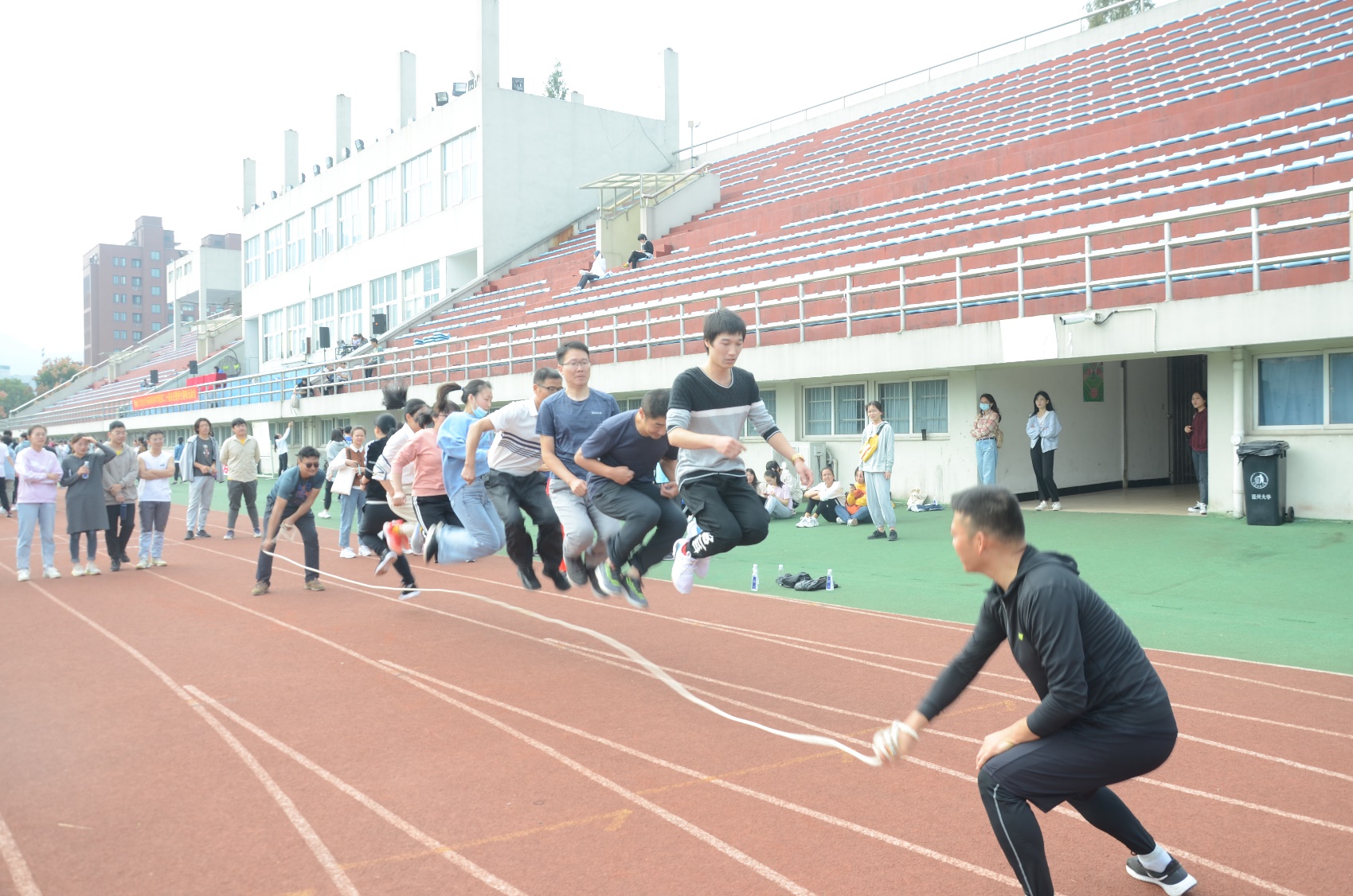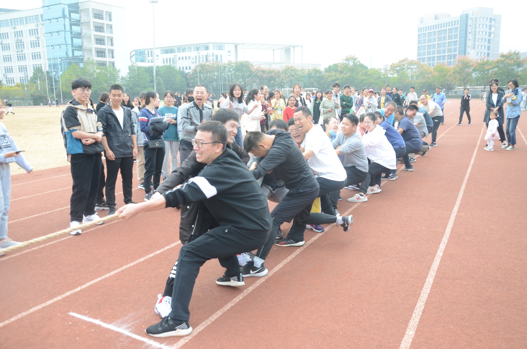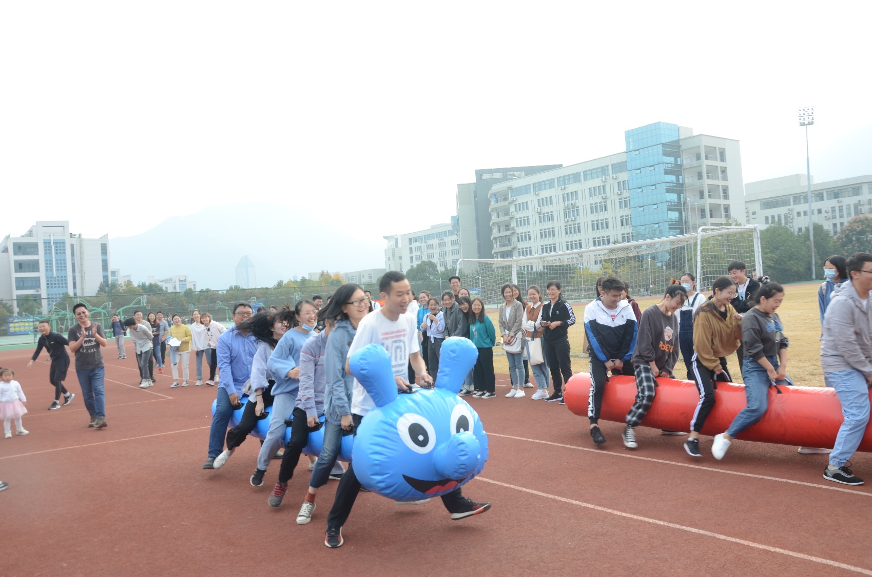 与此同时,教职工组和研究生组的的趣味运动也进行得如火如荼。在拔河比赛中,教工组与研究生对阵。因为多年相熟,教工组配合得异常默契,在“一二——一二”指挥声和周围同学们的呐喊声中,教工组紧握麻绳,齐心协力,场面热闹非凡。在有趣的“毛毛虫”比赛中,平常有些严肃的老师们也不禁笑得像个孩子,整个比赛过程都洒满了老师和同学们的的欢声笑语。