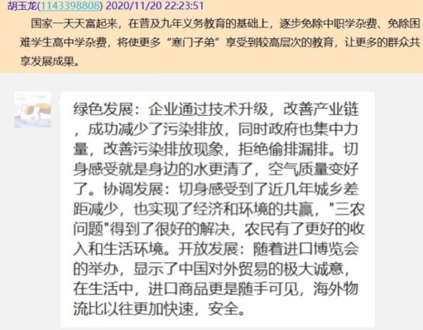 为了深入学习十九届五中全会精神,公司各团支部于2020年11月20日至2020年11月22日组织了主题学习活动。本次活动共有14个班级团支部,594位同学参与。各班级团支部主要以团日活动或线上、下学习交流会的方式进行全会精神的学习。其中19生科2班则增加了一个特色环节:抢答环节。此环节既增加了学习活动的趣味性又使同学们印象更加深刻。19环工和18环科则以问卷调查的形式了解同学们的学习情况。其他班级也以视频、演讲等直观的方式让同学们贯彻全会精神。