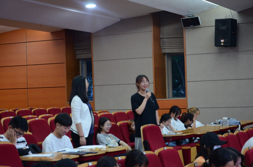 首先,周老师从定义下手让同学们去理解“演讲”的意思,接着她强调了想要做好一篇演讲的核心是主旨明确、逻辑性强、自信大方、体态端庄。并对这四个方面进行了详细的讲解。在同学们对演讲有了初步的认识后,周老师又向我们介绍了演讲的基本要素、演讲的特点以及演讲的标准。她以简明概要的言语清晰地向同学们讲解了这些演讲的要点,并提供了一些演讲技巧以供同学们参考。最后,周老师给同学们提供了“遇见”和“我爱祖国”这两个演讲题目,在给了三分钟准备时间后,随机抽了四位同学进行三分钟的即兴演讲并为他们提供了宝贵的指导意见。