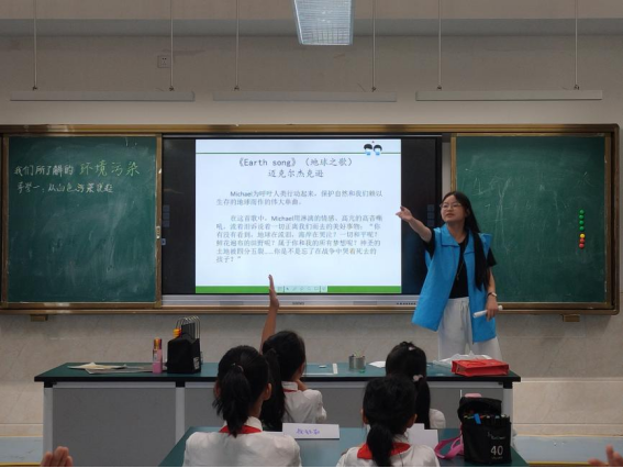 李老师以生活中的塑料作为引入,通过问答互动的方式,引出一种普遍的环境污染现象——白色污染。李老师通过生动的图片展示,配合《塑料袋漂流记》的故事,让同学们了解到塑料的危害,同时鼓励孩子们结合自己的实际生活,思考在自己身边发现的一些白色污染的现象。小李老师通过特定的情境问答:如果生活环境中没有塑料制品,我们的生活会变得怎么样,来显示塑料在日常生活使用中的普遍性,同时为同学们简单地介绍一些国家为了解决白色污染问题提出的一些政策和解决措施,并扩展了寻找塑料的替代品这一解决办法在现实生活中的实际应用。黄老师将环境污染大搜查作为导学目标,以迈克尔杰克逊的《地球之歌》视频作为引入,用生动的图片配合讲解,向孩子们介绍了农药污染、光污染、大气污染、噪声污染和水污染。孩子们通过小组讨论,举手发言互动,积极地参与整个课堂活动。 黄老师通过引用习近平总书记的“绿水青山就是金山银山”, 引出环境保护和可持续发展话题,并让孩子们进行小组讨论设计环境保护标语,来加深对保护环境学习的印象。在课堂上,孩子们积极参与每一个环节,踊跃发言,整个课堂其乐融融。