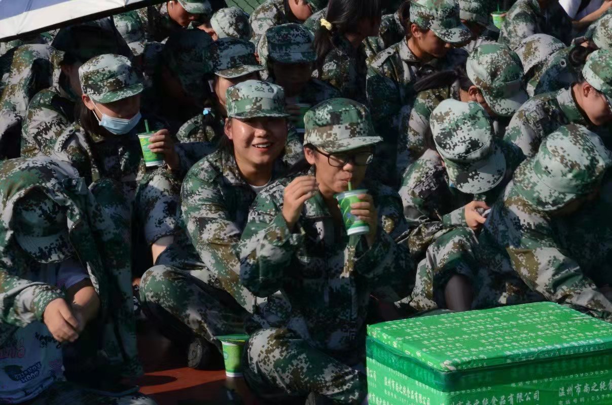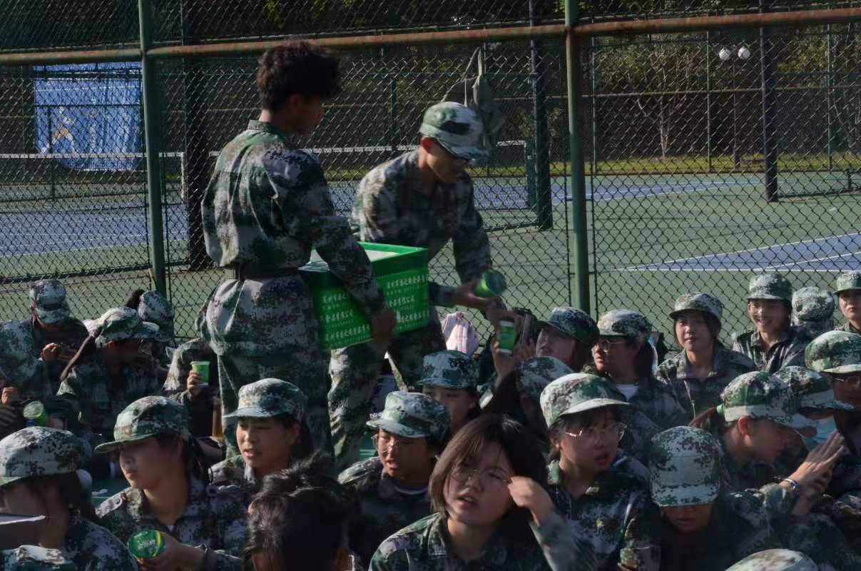 三点左右,同学们列好方阵,在场外等待许久的学长学姐们将一箱箱绿豆冰沙搬到各个方阵前,由各个班班长进行分发。在分发期间,邹婷学姐代表公司团委·员工会向同学们表达了关怀与鼓励,“希望我们的到来和这份“清凉”能给同学们带去欢乐。”而作为“回礼”,同学们也为他们献唱了在军训期间学习的军歌,如《团结就是力量》《强军战歌》等,展现了其富有活力、斗志昂扬的精神面貌!