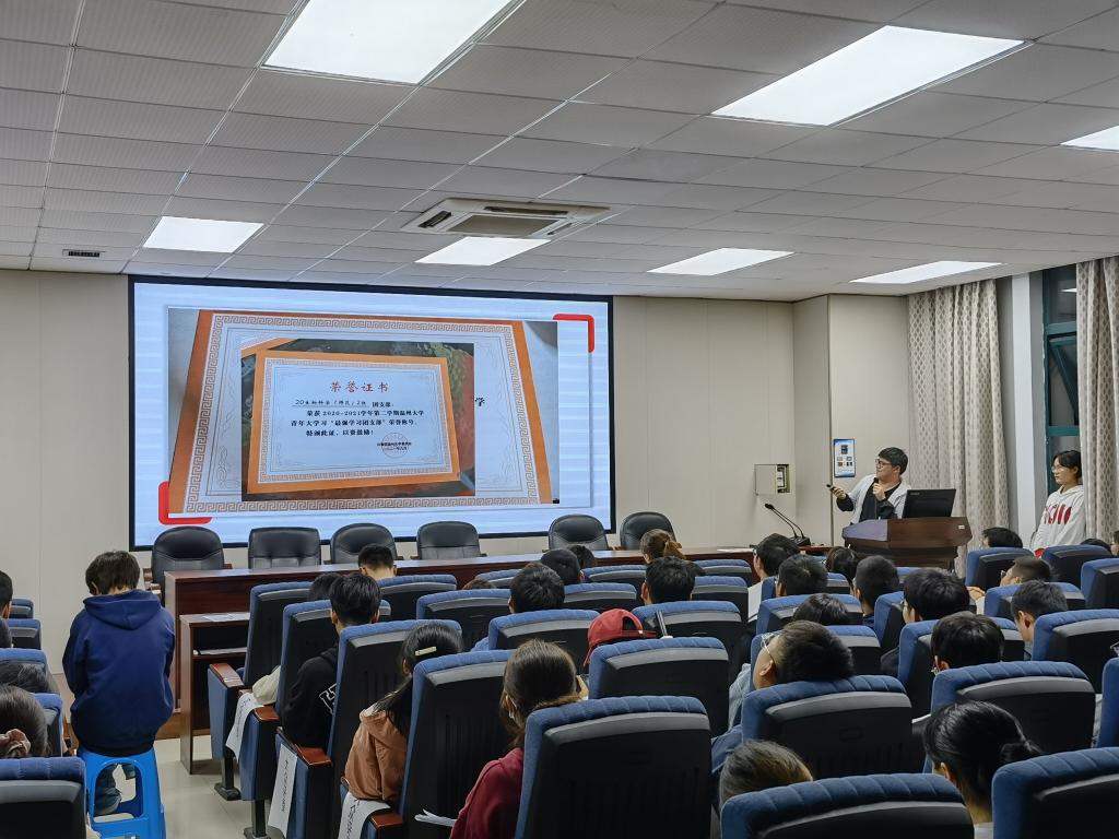 赵老师讲话结束后,学习标兵的评选随即开展。各位竞选人在讲台上意气飞扬,从各个方面角度出发,向评委和观众展示了自己丰富多彩的大学经历与未来规划,带来了一场精彩的个人秀。然后是优良学风班评选。各班代表从自己班级的综合成绩、班容班貌、团日活动、获得奖项等内容出发介绍,言语间洋溢着对班级的自信与身为班集体成员的自豪。在优秀个人与各班班集体代表为评委们带来了精彩的展示和答辩之后,评委们经过充分思考与讨论,递交出了自己宝贵的一票。