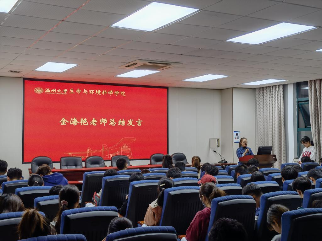 最后,金海艳老师进行总结发言。她从今天的一件小事情出发,讲述了告诉我们经历是一笔财富,让我们珍惜生活中每一次的机遇;又谈及到集体,教导我们参与融入一个优秀的集体,与集体一同成长;同时,她希望我们能寻找差距,“在树立信心的同时也要寻找差异”,积极向外向上学习。