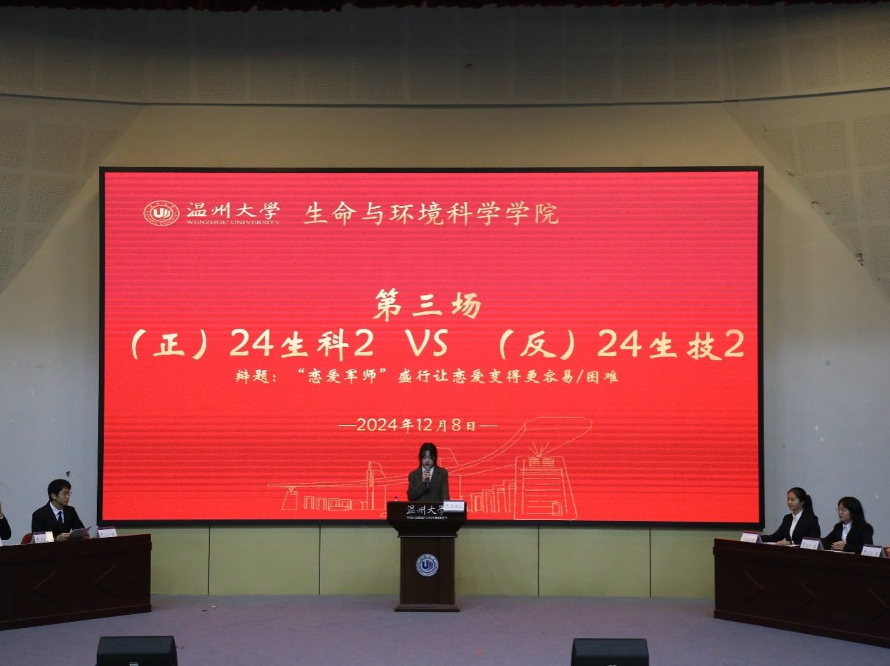 首场比赛以24生态为正方对战24生科1拉开序幕,正反双方以“八十一难的最后一难是吃肉,唐僧应/不应该吃”展开激烈交锋。开篇立论,正方同学引经据典,认为唐僧西行为天下苍生取得大乘佛法的使命不容失败,应决心坚定地渡完八十一难。反方同学则以佛教戒律至上为基,提出若违背了佛法道义,是对信仰的亵渎将难以弘扬大乘佛法的观点。当“弘传佛法心必正”碰撞上“打破顽空须悟空”,比赛现场燃出了不一样的火花。第二场比赛中,现实中的尖锐问题被搬上辩论的赛场,当资本的大手与文化的包容同台,辩题“城市让人变得更孤独/更不孤独”如投石入水泛起阵阵涟漪般引起了同学们的深思。正反双方互不相让、气氛紧张,评委细致点评,同学们认真观看。第三场的比赛更是以同学们喜闻乐见的辩题牢牢吸引了同学们的眼球。面对“‘恋爱军师’盛行让恋爱变得容易/困难”的辩题,正反双方既幽默诙谐又逻辑严密,旁征博引如探囊取物,引经据典似信手拈来,双方你来我往,将比赛引入高潮。