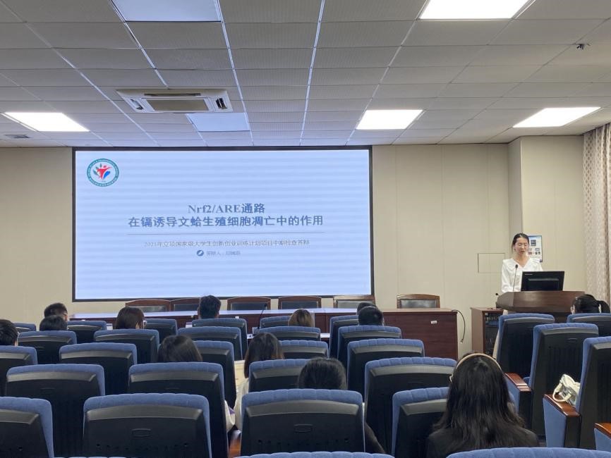 在答辩会前,赵书记鼓励各支队伍向国家级大创项目学习,认真完成项目研究。随后中期答辩正式开始,7个国家级大创项目以及22个校级大创项目依次上台答辩。各答辩人从项目介绍、中期成果、未来计划等方面展开汇报,逻辑缜密,辅之以PPT中的详细数据、实验记录、成果展出,多方面地展现了自己的项目。三位评委老师微微颔首、快速记录,时而轻声探讨、审阅资料,捕获汇报的每个细节。在答辩环节。各答辩人严肃认真,仔细地倾听老师提出的问题。评委老师从不同方面提出问题和专业性意见,答辩人不紧不慢做出应答。答辩在这样的思维碰撞中结束。各支项目通过此次中期检查答辩知晓了各自项目的不足之处,并会在接下来的时间里进行完善,以便结题时能有理想的结果。