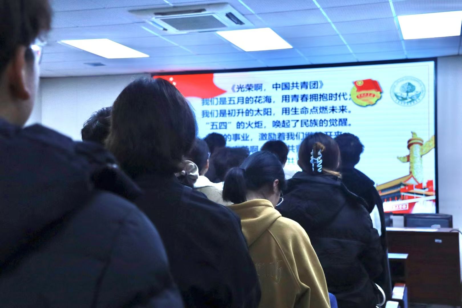 奏唱团歌,同学们整齐地站立,神情庄重。伴随着激昂的乐曲,大家齐声唱响团歌,歌声中充满了青春与力量,展现了团员的责任与使命。每个人的目光坚定,心中怀揣着对团组织的热爱与对未来的憧憬。
