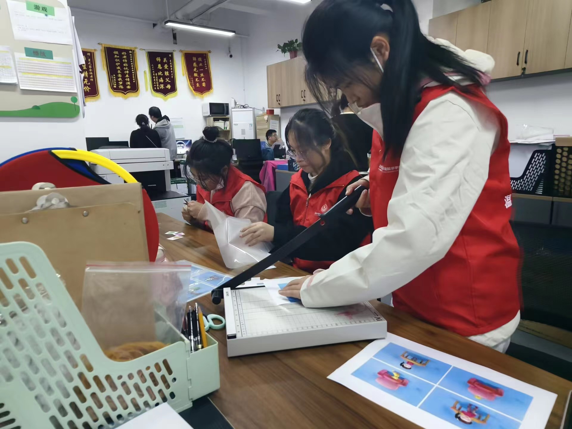 志愿者们按照通知在南校区东大门蓝色大棚集合并签到,活动负责人带领大家乘坐40路公交车前往星之家,到达雪山路站后,负责人分发了红马甲并讲述了此次活动大致内容以及重要事项。进入星之家后,在老师的引导下,志愿者们来到办公室,为更好帮助老师教学,志愿者们在老师的指导下开始制作教具。教具的制作有许多要考虑的地方,比如尽量延长教具的使用时长,还有教具的安全性等等。教具的制作过程十分繁杂,需要不断重复着打印,裁剪,修角的过程,其中的裁剪更是最为繁复且困难的工作,但在此过程中志愿者们,不怕苦,不怕累,集中注意力完成自己手上的工作,在自己工作完成的情况下,还积极帮助他人的工作。最终超额完成任务。活动结束后,志愿者们向老师表达了深深的感谢,老师也对于志愿者的到来表达感谢并且表示期待下一次合作。最后,志愿者们在星之家门口进行集体合影留念,结束这次活动。