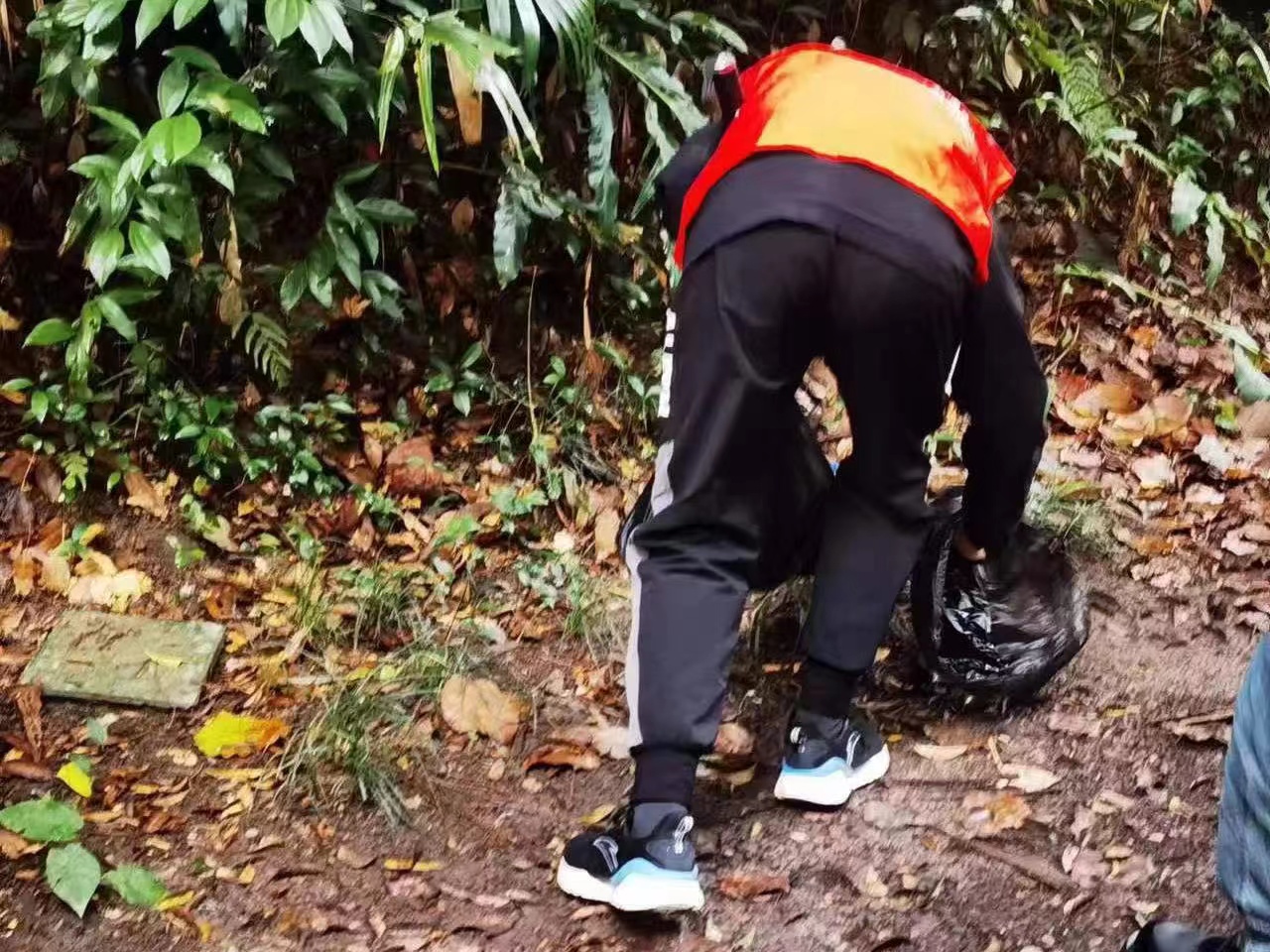 12:30左右,志愿者们身穿红马甲在南校东南门集合,共同乘坐公交车前往景山植物园。到达植物园后,志愿者们分成三小组,手持垃圾袋,沿着山路,在植物园的各个角落寻找并拾起路边的塑料瓶,纸巾等被人们随意丢弃的垃圾。活动期间,天空下起蒙蒙细雨,但这并没有影响志愿者们清理垃圾的进度和想要美化自然的心。随着一个个垃圾袋的装满,满目绿色中那些突兀的颜色逐渐消失,植物园也恢复了它原来的色彩,展现出更多的清新与生机。