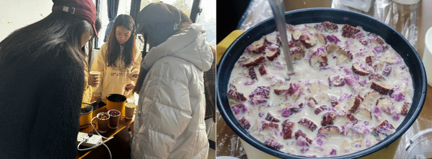 活动开始,后勤组的同学完成了场地整理和材料准备工作并引导同学们有序入座。随后,社长们详细介绍了罐罐烤奶和手工 DIY 郁金香花束的制作流程。在制作罐罐烤奶环节,成员们依照步骤,先将红茶叶倒入罐子中翻炒,直至茶香四溢,接着加入冷水,煮至水沸腾。随后,再加入纯牛奶继续加热,待奶茶微微冒泡时,放入糖浆、玫瑰花干、红枣以及适量枸杞,耐心等待其再次沸腾即可。