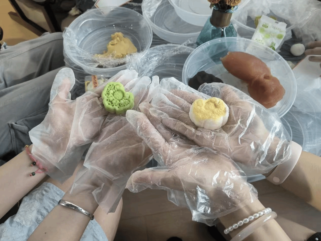 活动现场热闹非凡,充满了欢声笑语。工作人员早早准备好制作月饼所需的面粉、馅料、模具等材料和工具。活动伊始,指导人员向大家详细讲解了烤月饼和冰皮月饼的制作方法、技巧和注意事项。同学们认真聆听,跃跃欲试。