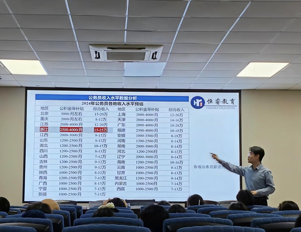 讲座中,宋老师围绕2026届全年考试时间线进行了详细梳理,涵盖黑龙江选调、浙江选调、国考、浙江省考等多项考试,明确各考试的笔试和面试时间,为同学们制定备考计划提供有力依据。同时,宋老师结合大数据,深度剖析不同地区、不同岗位的招录比例变化,直观地呈现历年岗位招录趋势,让考生更好地选择合适的报考岗位。此外,针对大家关心的公务员薪资福利体系,宋老师也进行了全面解读,帮助同学们以理性视角看待这份职业,做出更符合自身需求的职业规划。