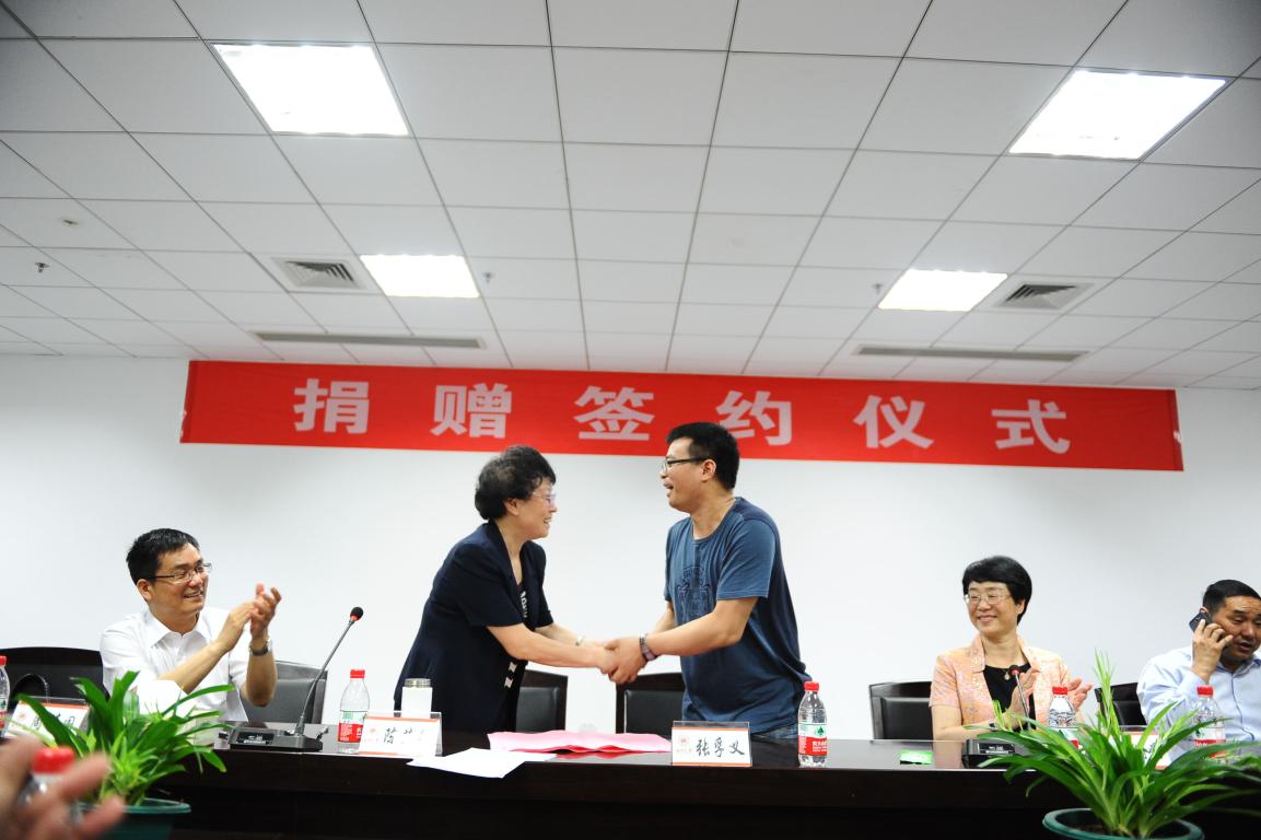图为签订捐资协议(左为陈艾华书记、右为张孚义)