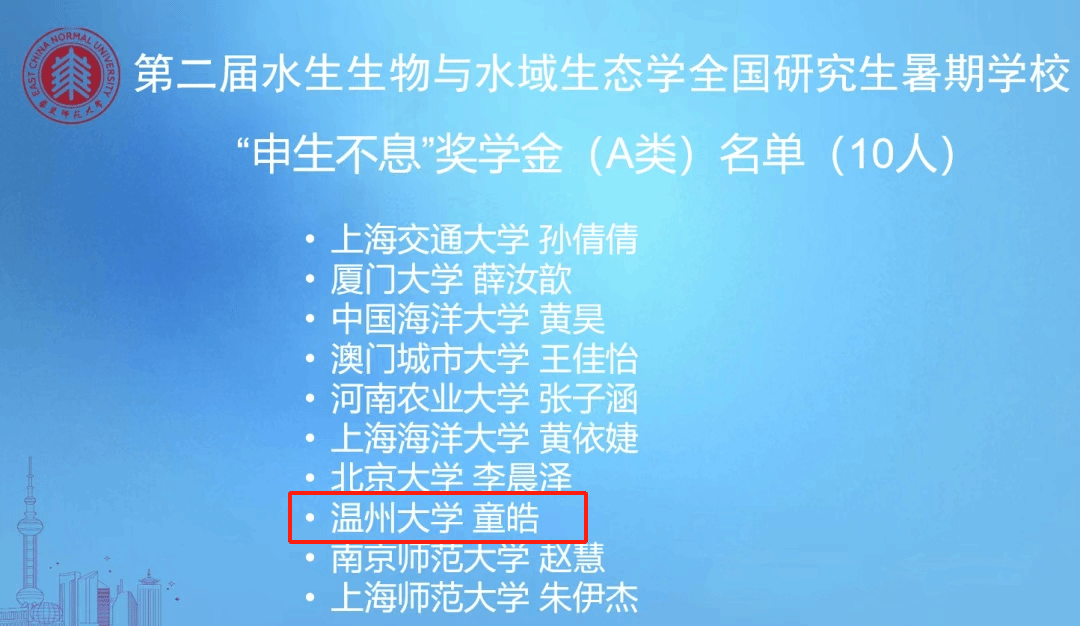 在刚刚落幕的由华东师范大学主办的第二届水生生物和水域生态学全国研究生暑期公司中,2022级生态学本科班童皓同学凭借扎实的专业功底和出色的表现,在激烈的竞争中脱颖而出,荣获含金量最高的A类奖学金(全国仅10人)。这份荣誉不仅是对童皓个人学术能力的肯定,也是其在永利集团官网三年学习厚积薄发的缩影。让我们一起来了解这位优秀学子的探索之路吧!