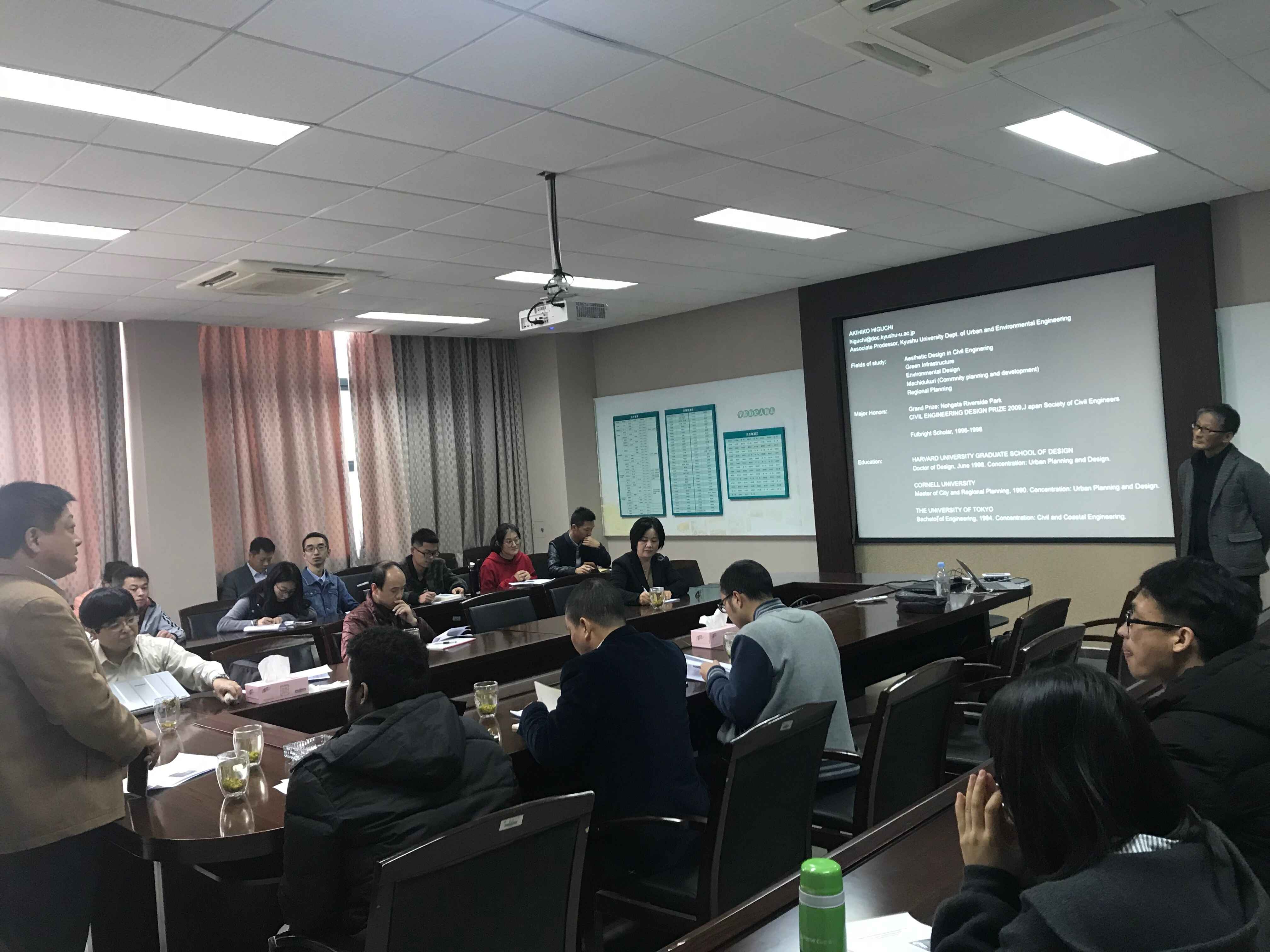 樋口明彦教授由日本远贺川和今野河川的河道结构特点讲起,详细介绍这两个河道不是通过水泥和石头修建河堤来改造,而是通过种植植物来改善河道,着重强调这种以生态方式改造的河道不仅降低了维护成本,而且显著改善了河道两侧的生态环境,是一种治理河道的新理念。在报告过程中,樋口明彦教授和师生进行了多次互动。报告结束后,员工向樋口明彦教授提出了很多问题,樋口明彦教授详细地做了解答,整场学术报告气氛热烈。