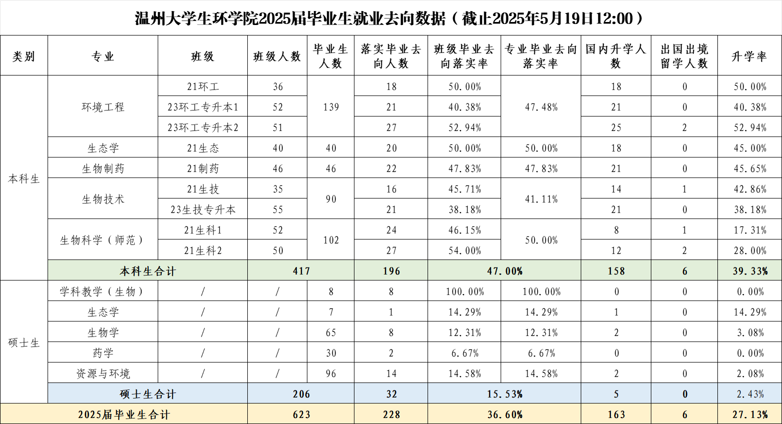 截至5月19日12:00,2025届毕业生毕业去向落实率为36.60%,其中硕士毕业生毕业去向落实率15.53%,本科生毕业生毕业去向落实率47.00%,具体情况见下表。请各班级、各导师高度重视毕业生就业工作,切实采取有力举措,促进毕业生更高质量更加充分就业。