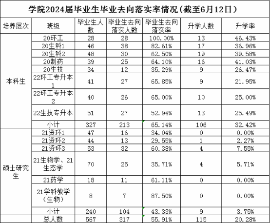 截至6月12日,2024届毕业生毕业去向落实率为55.91%,其中硕士毕业生毕业去向落实率43.33%,本科毕业生毕业去向落实率65.14%,具体情况见下表。各班级、各导师要高度重视毕业生就业工作,切实采取有力举措,促进毕业生更高质量更加充分就业。
